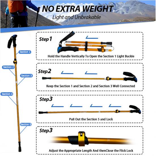 Prodotto : 1 paio di bastoncini da trekking in alluminio pieghevoli, estensibili e pieghevoli Nordic a 5 sezioni offrono stabilità, leggerezza, altezza regolabile e portabilità compatta per passeggiate all'aperto, arrampicata e zaino in spalla.
