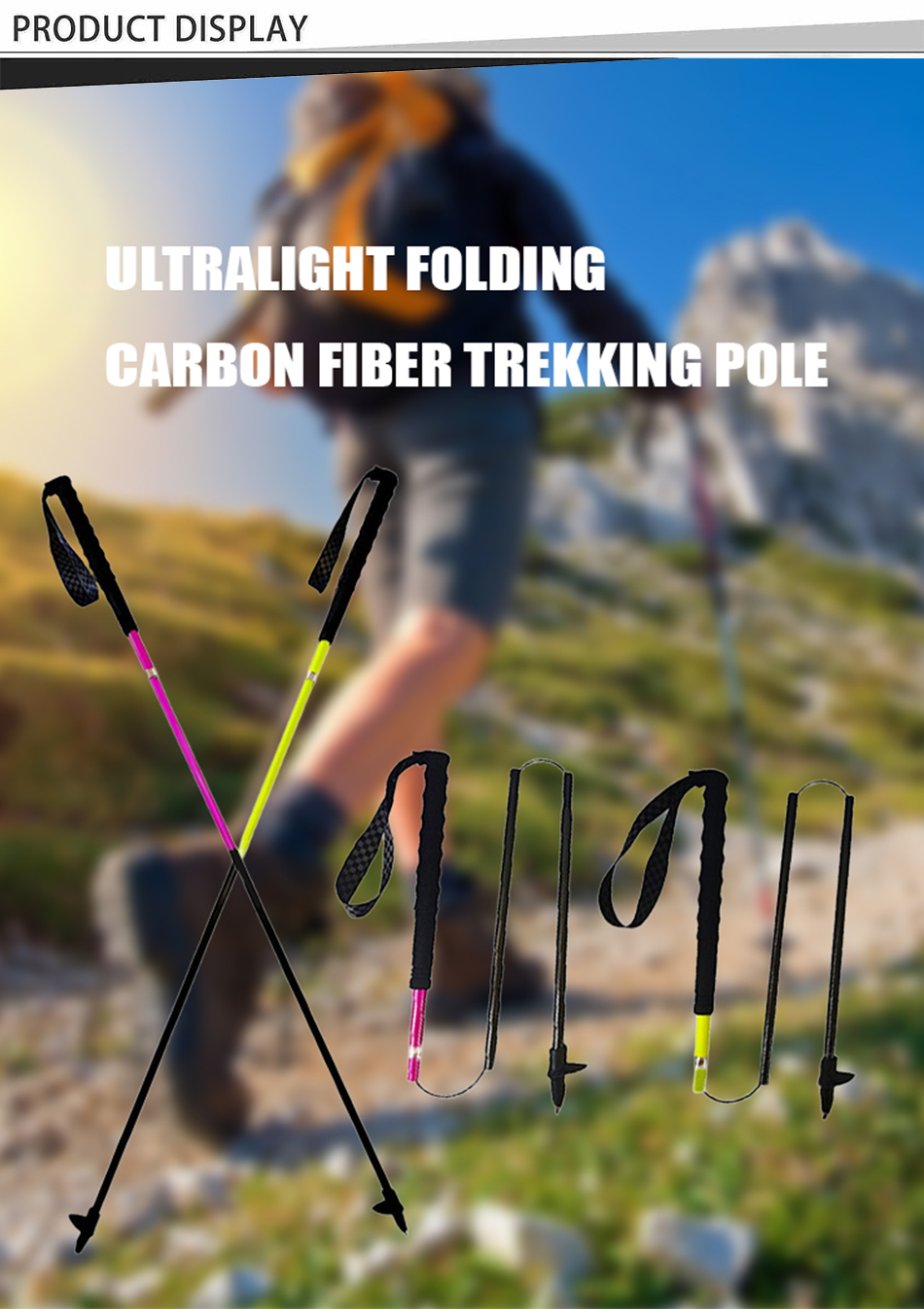 Prodotto : I bastoncini da trekking pieghevoli ultraleggeri da 135 g in fibra di carbonio 3K sono caratterizzati da una struttura resistente, impugnature ergonomiche e portabilità compatta, offrendo stabilità e supporto per il nordic walking e le avventure più impegnative.