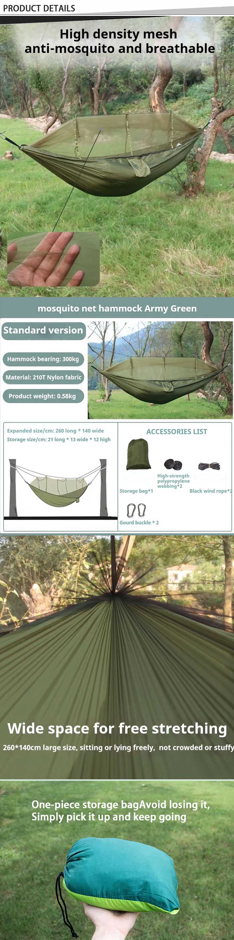 Prodotto : Questa amaca a doppia persona da 300ie da 300 qui è dotata di reti di zanzare integrata per la protezione, che offre un design spazioso, confortevole e traspirante, perfetto per il campeggio all'aperto, le escursioni e le avventure rilassanti.