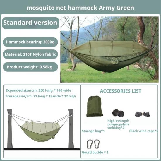 Realizzato in tessuto di alta qualità, traspirante e durevole, ospita comodamente due persone, rendendolo ideale per il campeggio, le escursioni, lo zaino in spalla o il cortile. La rete di zanzare integrata fornisce una protezione efficace contro gli insetti, garantendo un riposo pacifico e ininterrotto in natura.