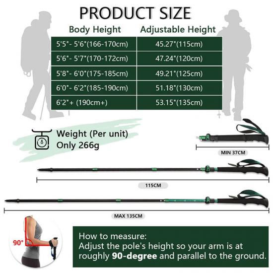Adottando un sistema di bloccaggio a combinazione, questo bastoncino da trekking si combina con il bloccaggio rapido e il bloccaggio a rotazione, e una molla anti-shock è incorporata nell'area del bloccaggio a rotazione, quindi l'impatto del danno è minore. Puoi muoverti sempre più velocemente utilizzando energia. altezza regolabile, i bastoncini da passeggio si adattano alla maggior parte delle persone. Inoltre, il bastoncino da trekking con graduazioni chiare e una punta di arresto che può estendersi da 25" a 53". È il più piccolo e leggero possibile. Adatto a tutte le altezze, da corte a uomini alti, donne e persino bambini! Fare attenzione a non superarlo.