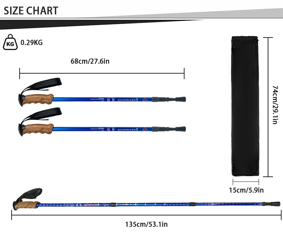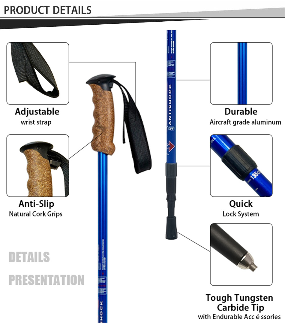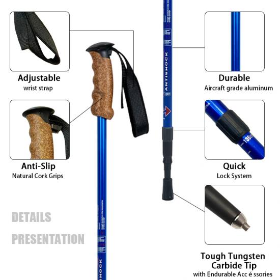 Prodotto : I bastoncini da trekking regolabili realizzati in resistente alluminio 7075 sono caratterizzati da un design leggero e pieghevole, chiusure rapide a scatto, impugnature ergonomiche e stabilità affidabile per trekking, arrampicata e avventure all'aria aperta.