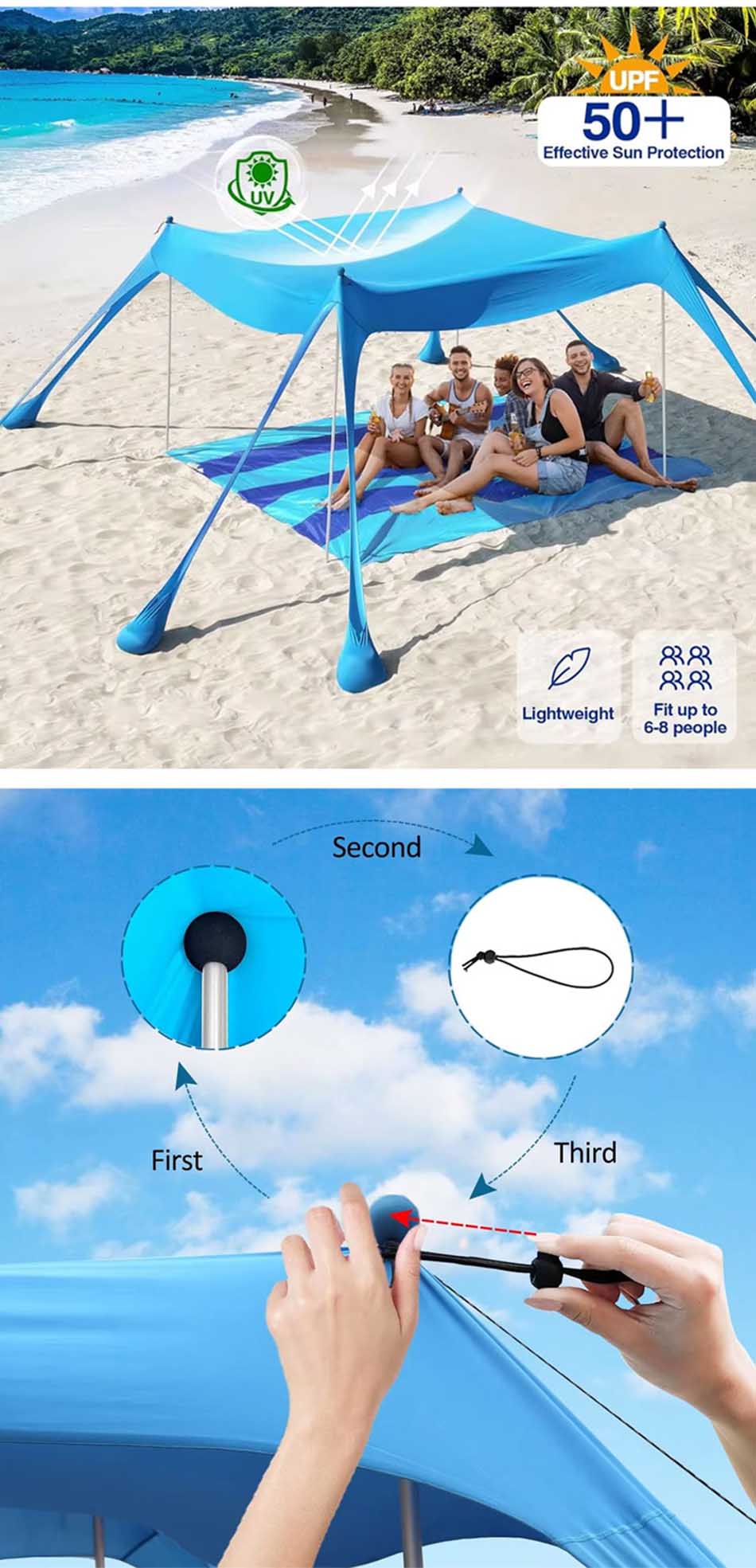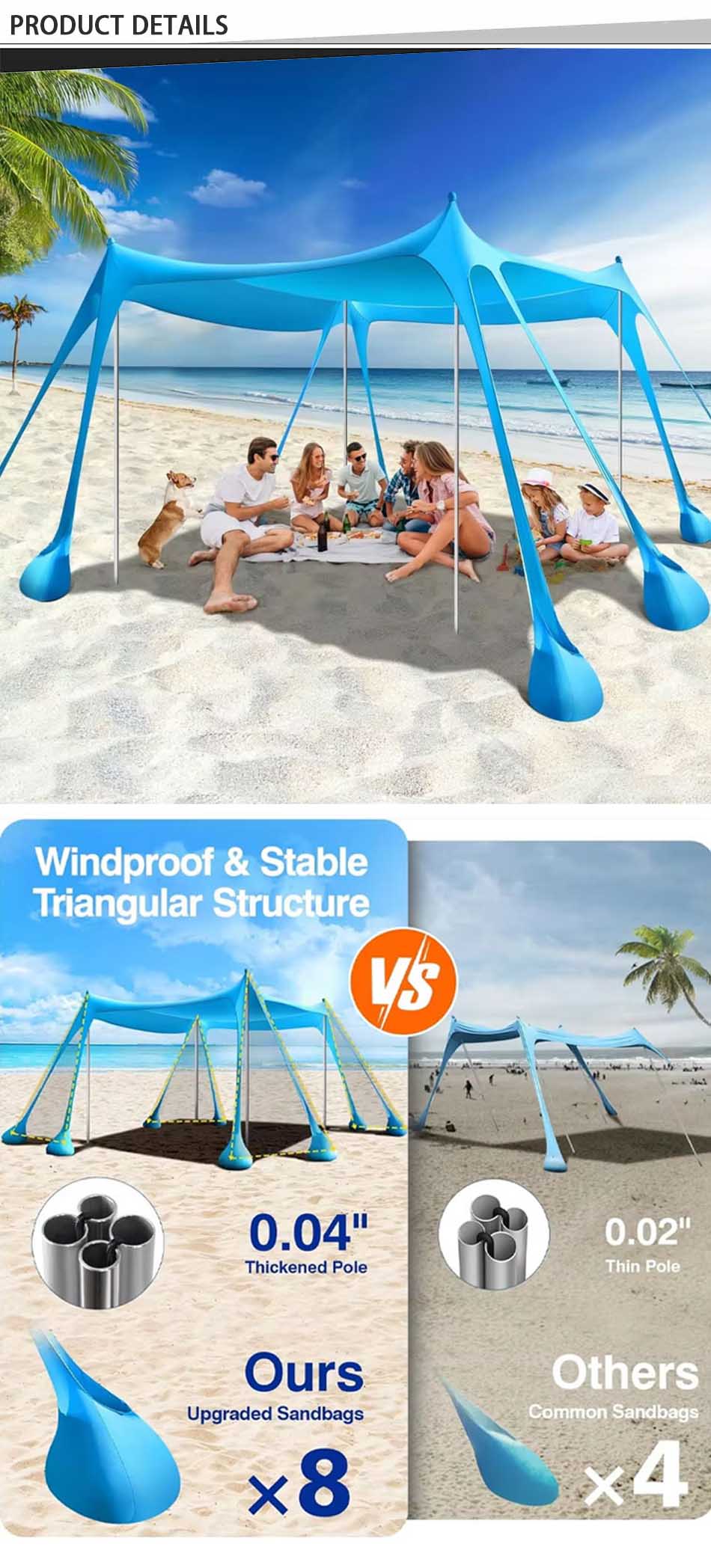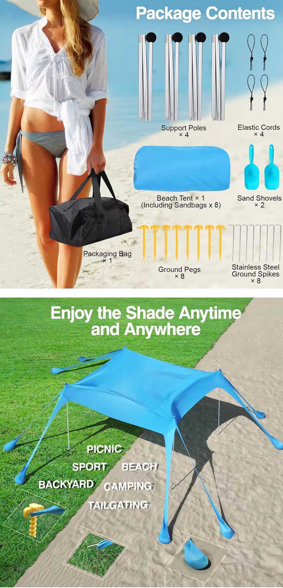 Prodotto : Questo riparo parasole da campeggio offre un'affidabile protezione UV e una copertura traspirante, rendendolo un riparo portatile ideale per la spiaggia, per rilassarsi all'aperto e proteggersi dal sole.