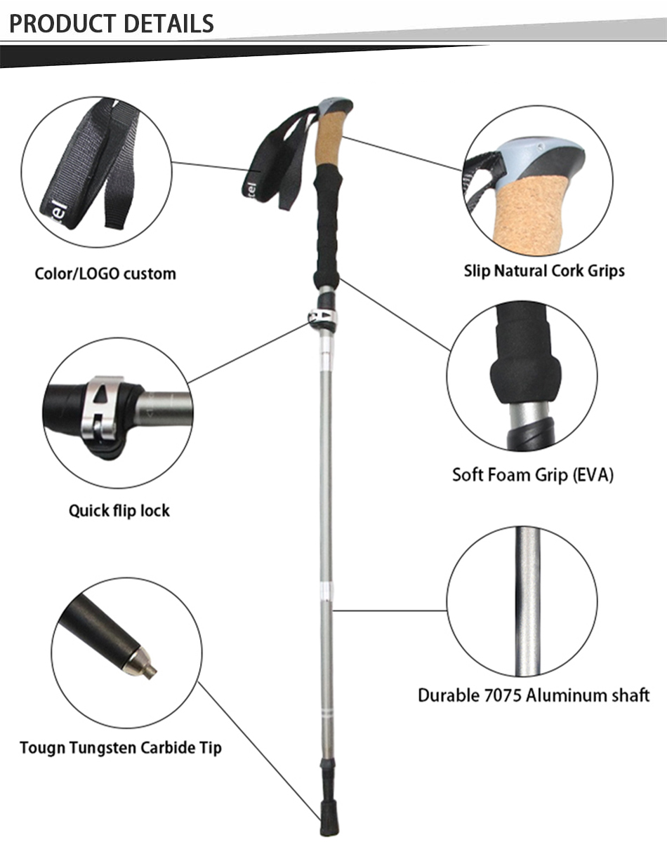 Prodotto : I bastoncini da trekking personalizzati in alluminio aeronautico 7075 a 5 sezioni sono dotati di impugnatura in sughero, design pieghevole, cinturino di sicurezza e opzioni OEM per prestazioni di camminata ed escursionismo durevoli, leggere e versatili.