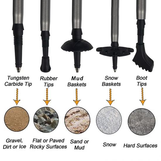 I bastoncini da trekking in alluminio aeronautico 7075 a 5 sezioni personalizzati offrono una soluzione pieghevole per passeggiate ed escursioni di alta qualità, durevole e ultraleggera, progettata con un'impugnatura in sughero naturale per un maggiore comfort, controllo dell'umidità e presa, dotata di un affidabile sistema di cinghie regolabili per un supporto sicuro del polso, una struttura compatta e pieghevole che si ripiega senza sforzo per il viaggio e una robusta struttura in alluminio aeronautico che garantisce una resistenza eccezionale su terreni ripidi, rocciosi o irregolari, mentre l'opzione OEM consente ai marchi di personalizzare colori, loghi, accessori e confezioni per esigenze di mercato personalizzate, creando in definitiva un set di bastoncini da esterno versatile, ergonomico e ad alte prestazioni, ideale per escursionisti, trekker, backpacker e viaggiatori avventurosi che cercano stabilità affidabile e prestazioni durature in un'ampia gamma di ambienti esterni.