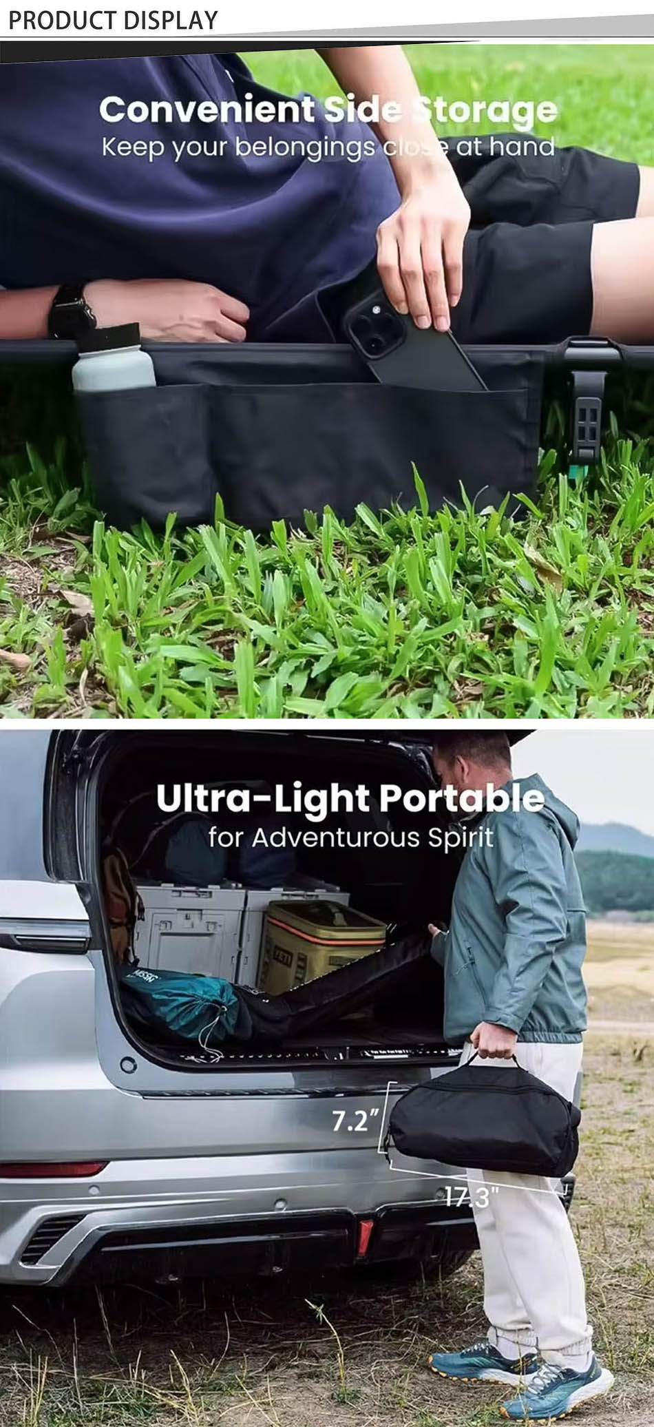 Prodotto : Questa lettino da campeggio a pieghe portatile per esterno su misura esterna di alta qualità offre un supporto resistente, una facile configurazione e una conservazione compatta, offrendo comfort e comodità per le avventure in campeggio e all'aperto.