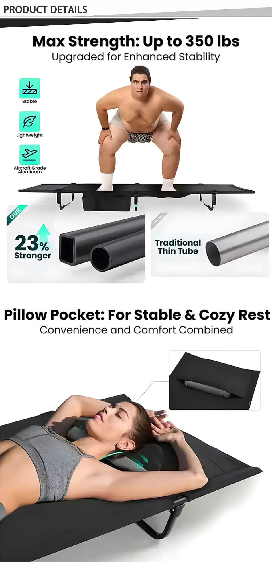 Marca : FABBRICA ANHUI FEISTEL Produzione correlata : OEM e ODM Prodotto : lettino da campeggio singolo leggero, pieghevole e resistente in alluminio con piedini antiscivolo e maniglia per il trasporto per un facile trasporto, perfetto per attività all'aperto e pernottamenti.