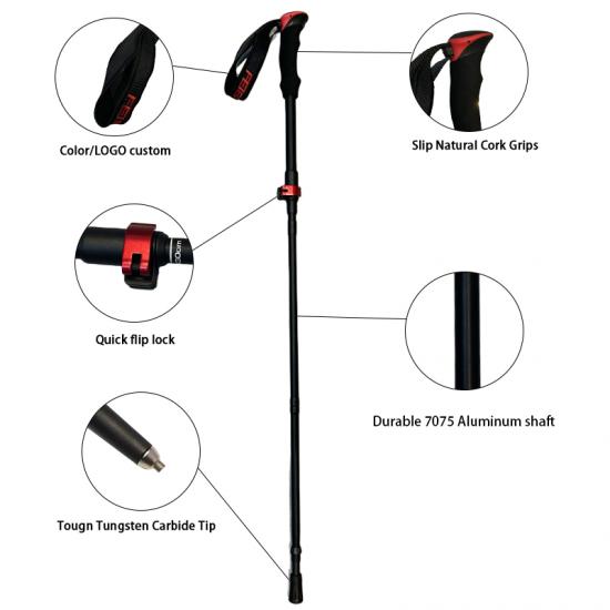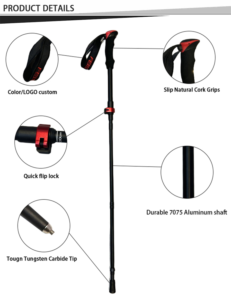 Marca : FABBRICA DI ANHUI FEISTEL Relaziona la produzione : OEM e ODM Prodotto : I bastoncini da passeggio pieghevoli multifunzionali in alluminio 7075 ultraleggeri sono caratterizzati da una struttura resistente, comode impugnature in EVA e una portabilità compatta, offrendo un supporto affidabile per escursioni all'aperto, arrampicata, trekking e avventure di camminata quotidiane.