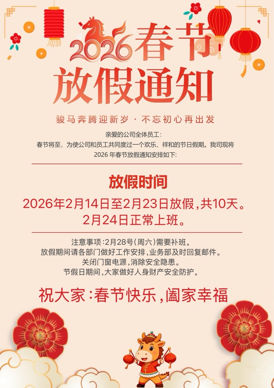 During the holiday period, production and shipment services will be temporarily suspended. Customers and business partners are kindly advised to plan their procurement and logistics in advance. Orders placed via the official website or email between February 14 and February 23 will be acknowledged automatically and processed in strict sequence starting February 24. For any urgent matters, partners may leave a message through the company’s official WeChat account; messages will be reviewed periodically and replied to upon resumption.