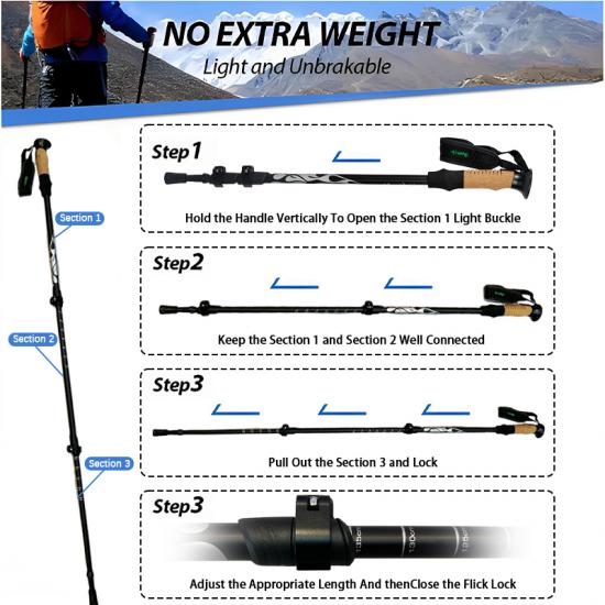 Bastone da trekking retrattile antiurto OEM prezzo di fabbrica, bastoncini da trekking in fibra di carbonio, bastoncino da trekking
