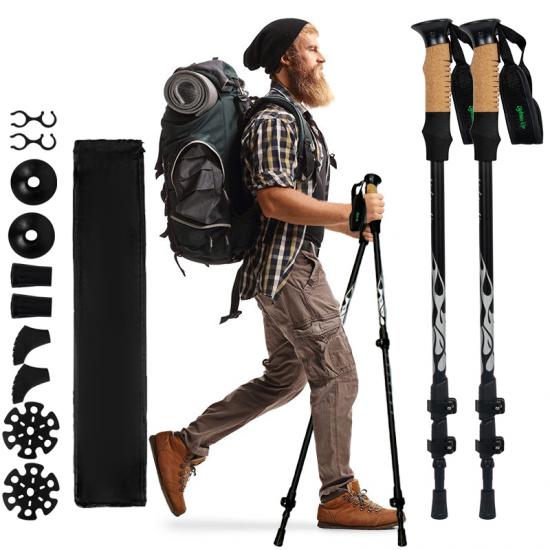 Prodotto : Bastoncini da trekking leggeri in alluminio di qualità aeronautica con impugnature estese e comode e versatili accessori per la punta, che garantiscono stabilità, durata e supporto per escursioni attive all'aperto, trekking e viaggi avventurosi.