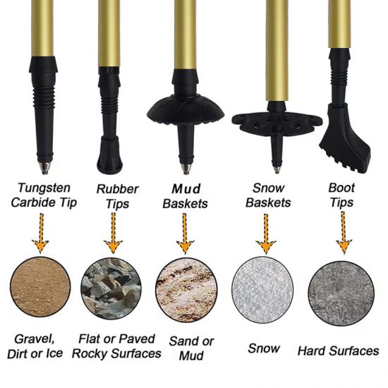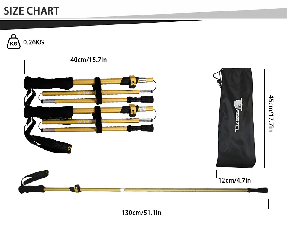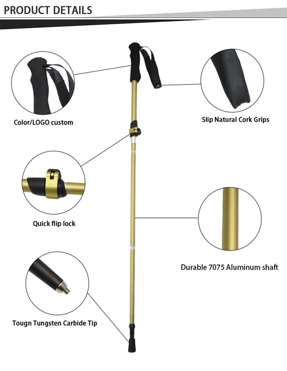 Marca : FABBRICA DI ANHUI FEISTEL Relaziona la produzione : OEM e ODM Prodotto : I bastoncini da passeggio pieghevoli multifunzionali in alluminio 7075 ultraleggeri sono caratterizzati da una struttura resistente, comode impugnature in EVA e una portabilità compatta, offrendo un supporto affidabile per escursioni all'aperto, arrampicata, trekking e avventure di camminata quotidiane.
