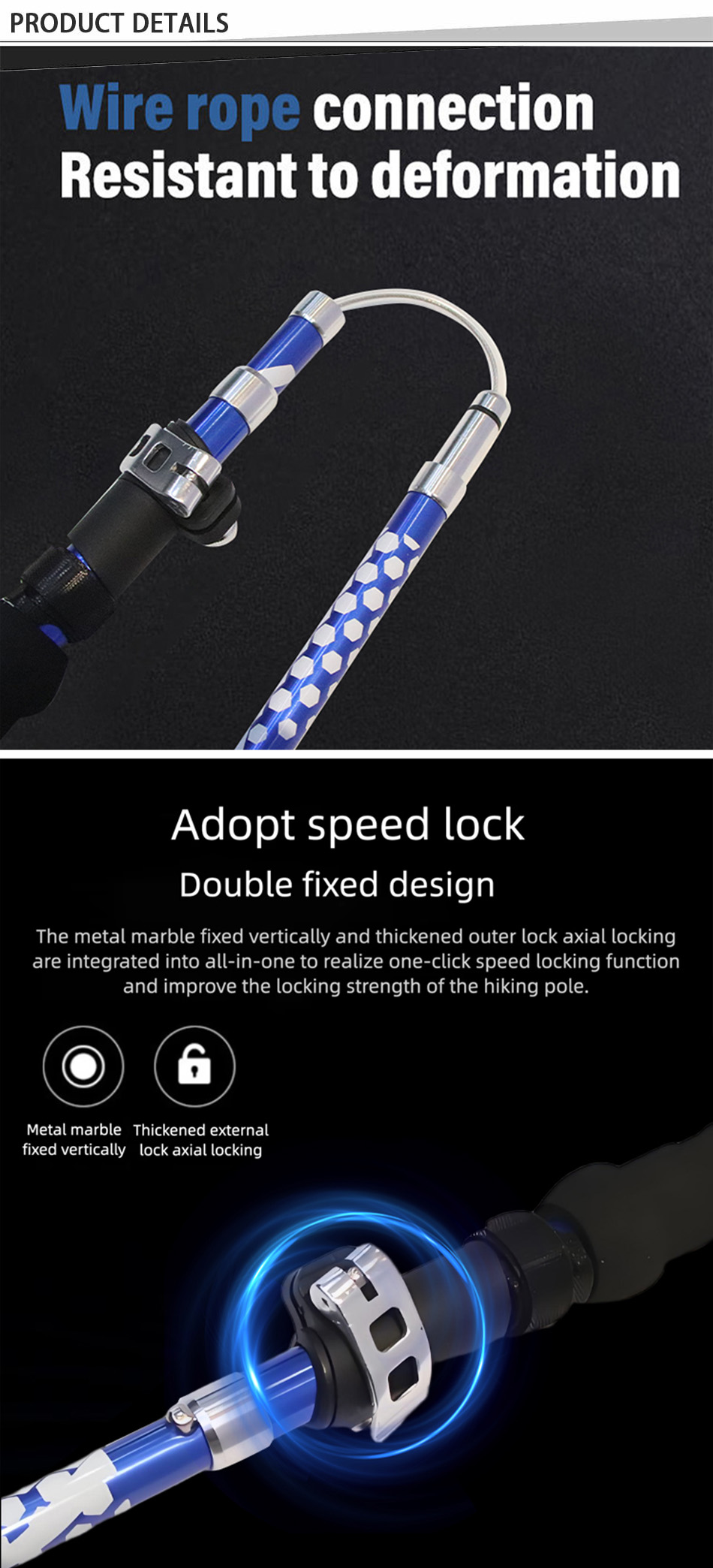 Adottando un sistema di bloccaggio a combinazione, questo bastoncino da trekking si combina con il bloccaggio rapido e il bloccaggio a rotazione, e una molla anti-shock è incorporata nell'area del bloccaggio a rotazione, quindi l'impatto del danno è minore. Puoi muoverti sempre più velocemente utilizzando energia.