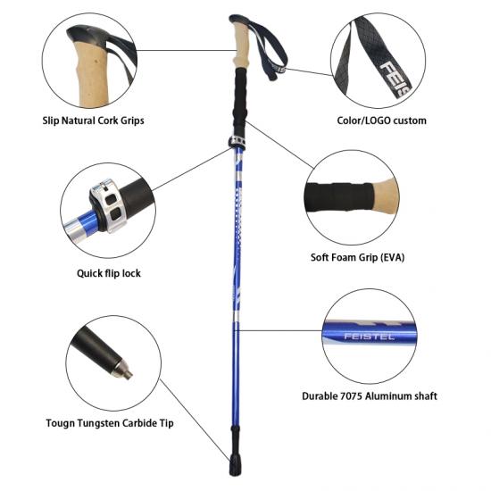Marca : FABBRICA DI ANHUI FEISTEL Relaziona la produzione : OEM e ODM Prodotto : I bastoncini da passeggio pieghevoli multifunzionali in alluminio 7075 ultraleggeri sono caratterizzati da una struttura resistente, comode impugnature in EVA e una portabilità compatta, offrendo un supporto affidabile per escursioni all'aperto, arrampicata, trekking e avventure di camminata quotidiane.