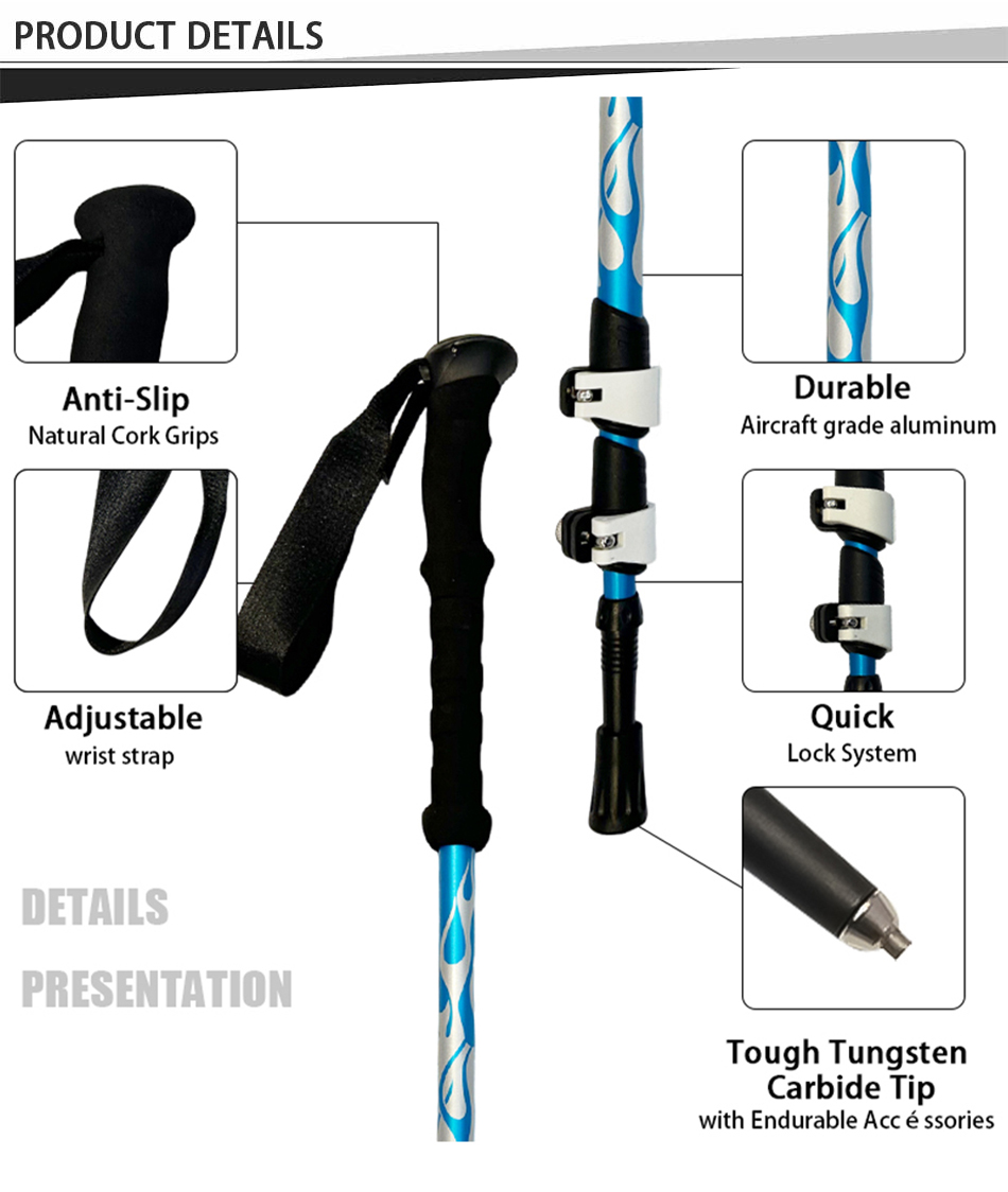 Marca: FABBRICA ANHUI FEISTEL Relativo alla produzione: OEM e ODM Prodotto: Bastoncino da trekking telescopico leggero in alluminio 6013: chiusure rapide a regolazione, resistente, versatile, ergonomico, leggero, ideale per l'escursionismo, lunghezza personalizzabile, resistente.
