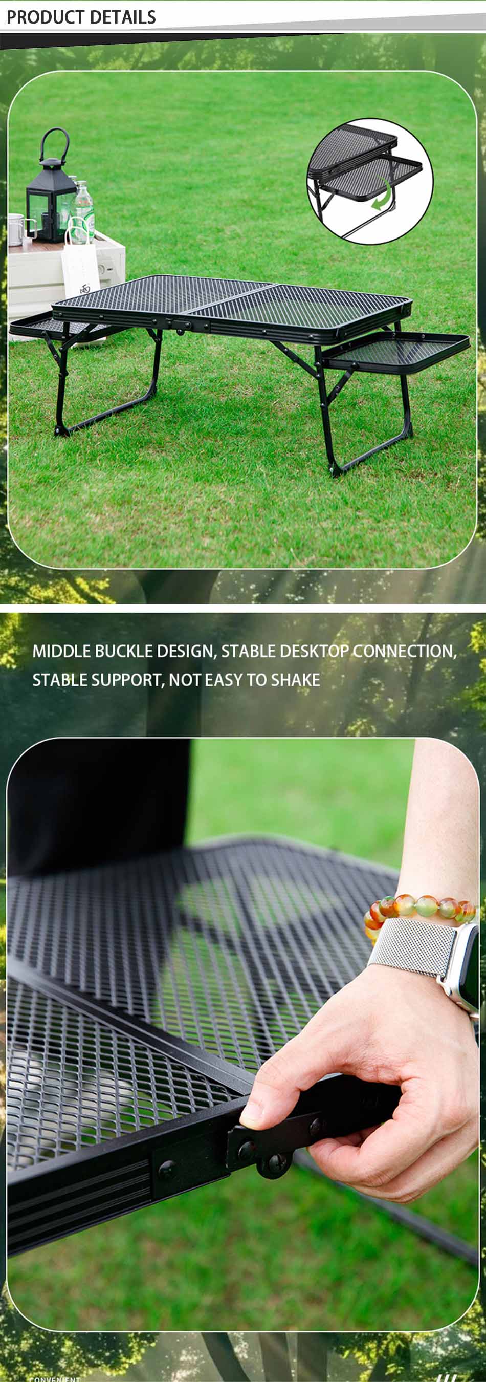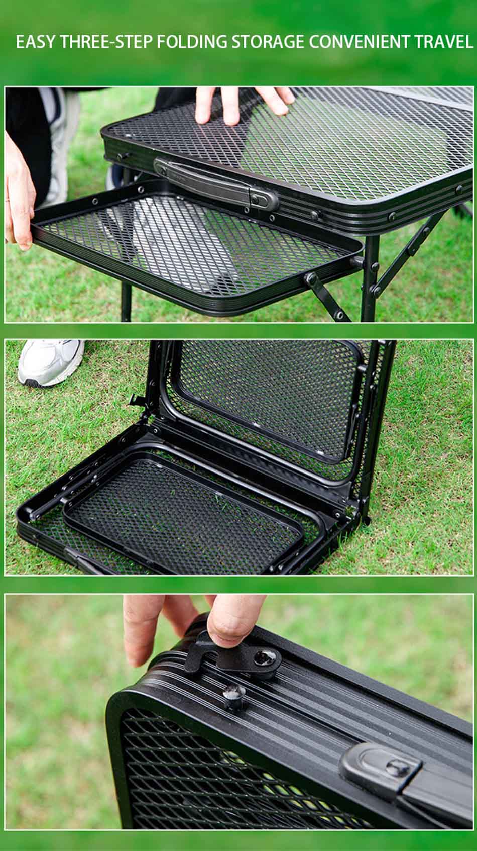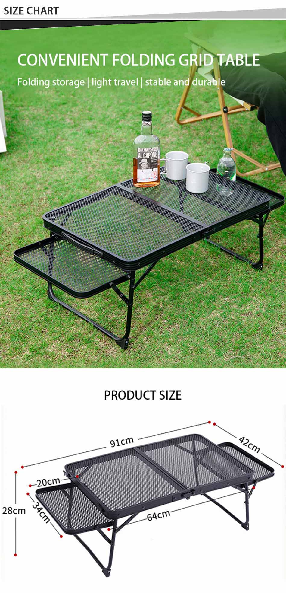 Prodotto : Il moderno tavolo pieghevole da campeggio in rete metallica è caratterizzato da una struttura in ferro leggero, una superficie in rete resistente, facile da trasportare e stabile: perfetto per barbecue, picnic e avventure all'aria aperta.