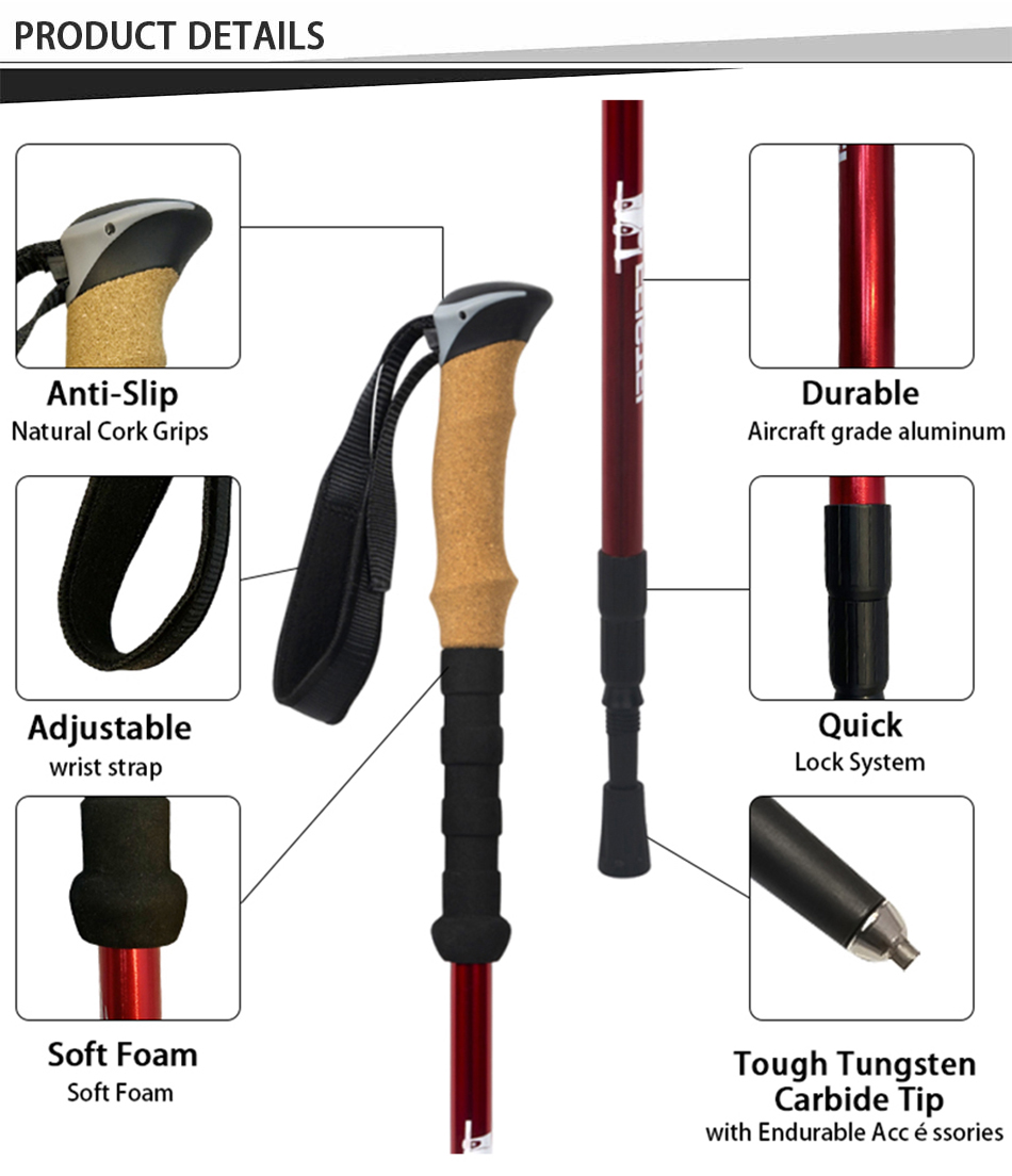 Marca: FABBRICA ANHUI FEISTEL Relativo alla produzione: OEM e ODM Prodotto: Bastoncino da trekking telescopico leggero in alluminio 6013: chiusure rapide a regolazione, resistente, versatile, ergonomico, leggero, ideale per l'escursionismo, lunghezza personalizzabile, resistente.