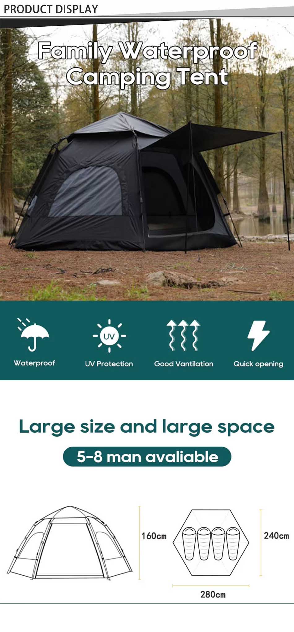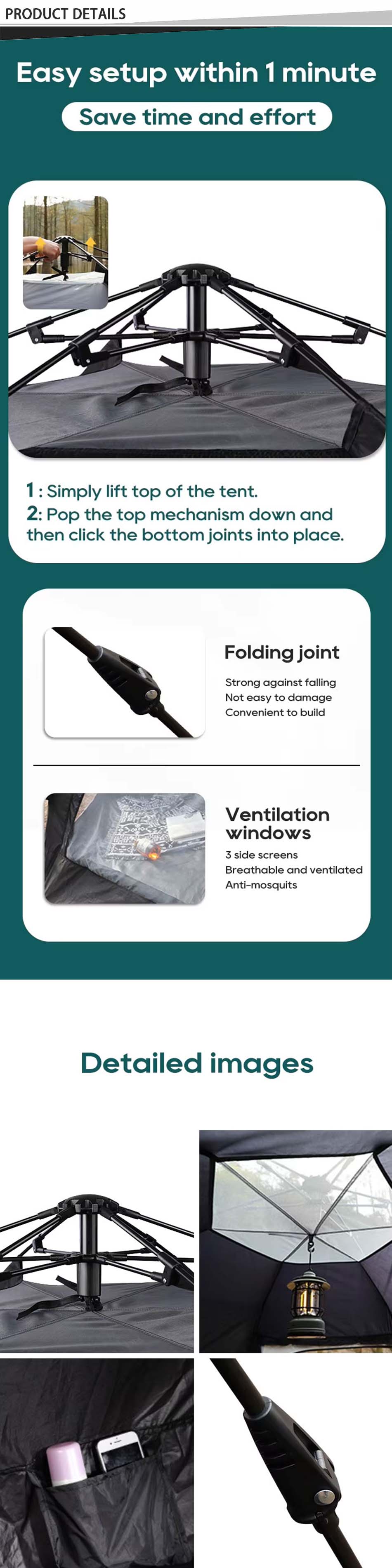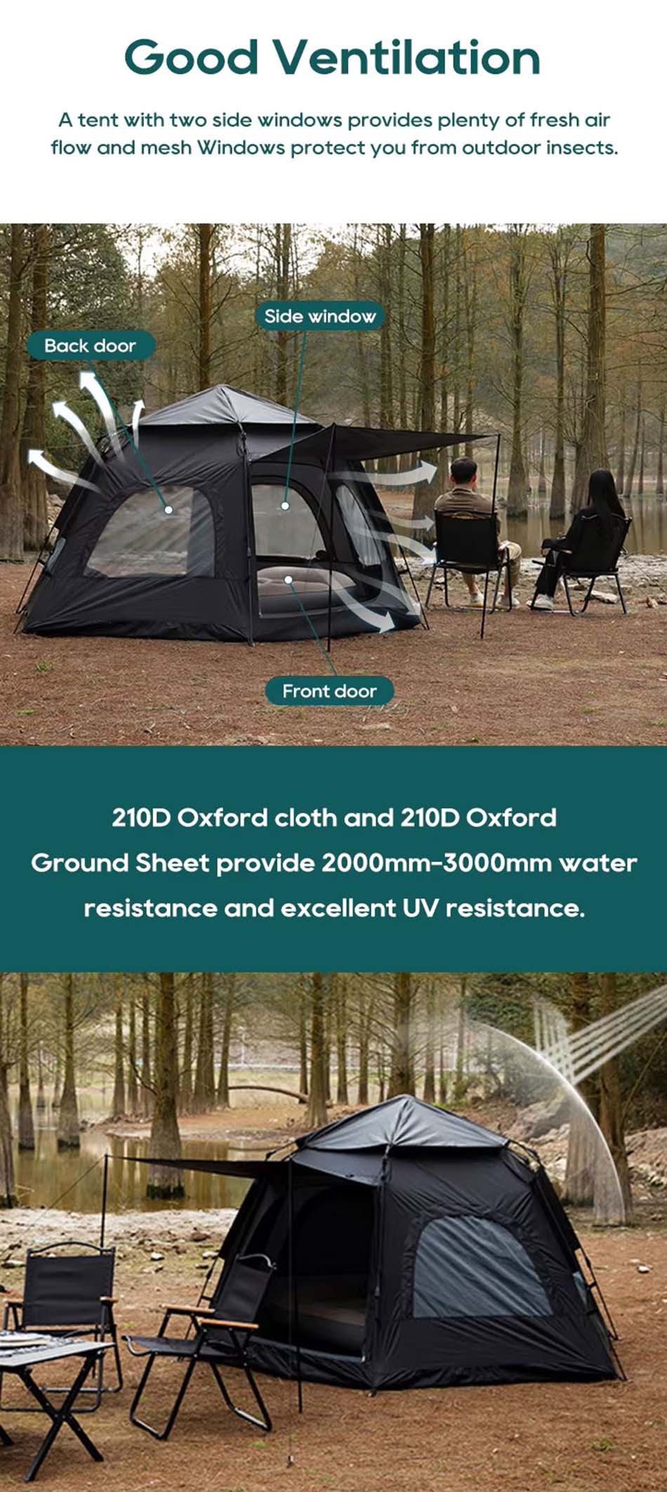 Con un design pop-up automatico, si istituisce in pochi secondi, eliminando la seccatura del tradizionale gruppo di tenda. Realizzato in tessuto di alta qualità e resistente ai raggi UV, offre un'eccellente protezione solare garantendo ventilazione attraverso i finestrini a rete per il flusso d'aria.