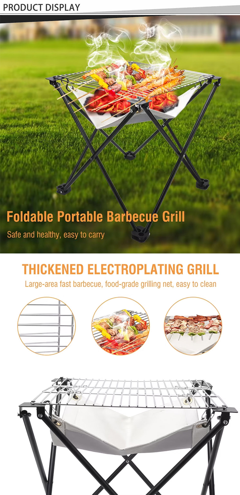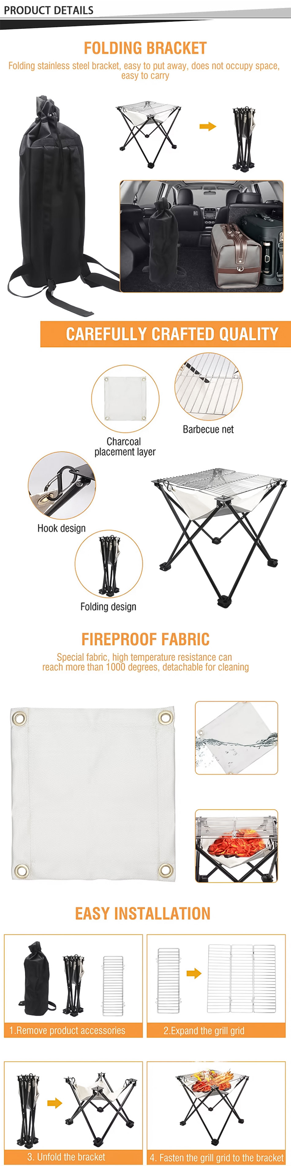 Prodotto : Questa griglia pieghevole portatile esterna dispone di un tessuto ignifugo, un telaio in acciaio inossidabile e un design compatto, rendendolo resistente, leggero, resistente al calore e perfetto per i picnic BBQ.