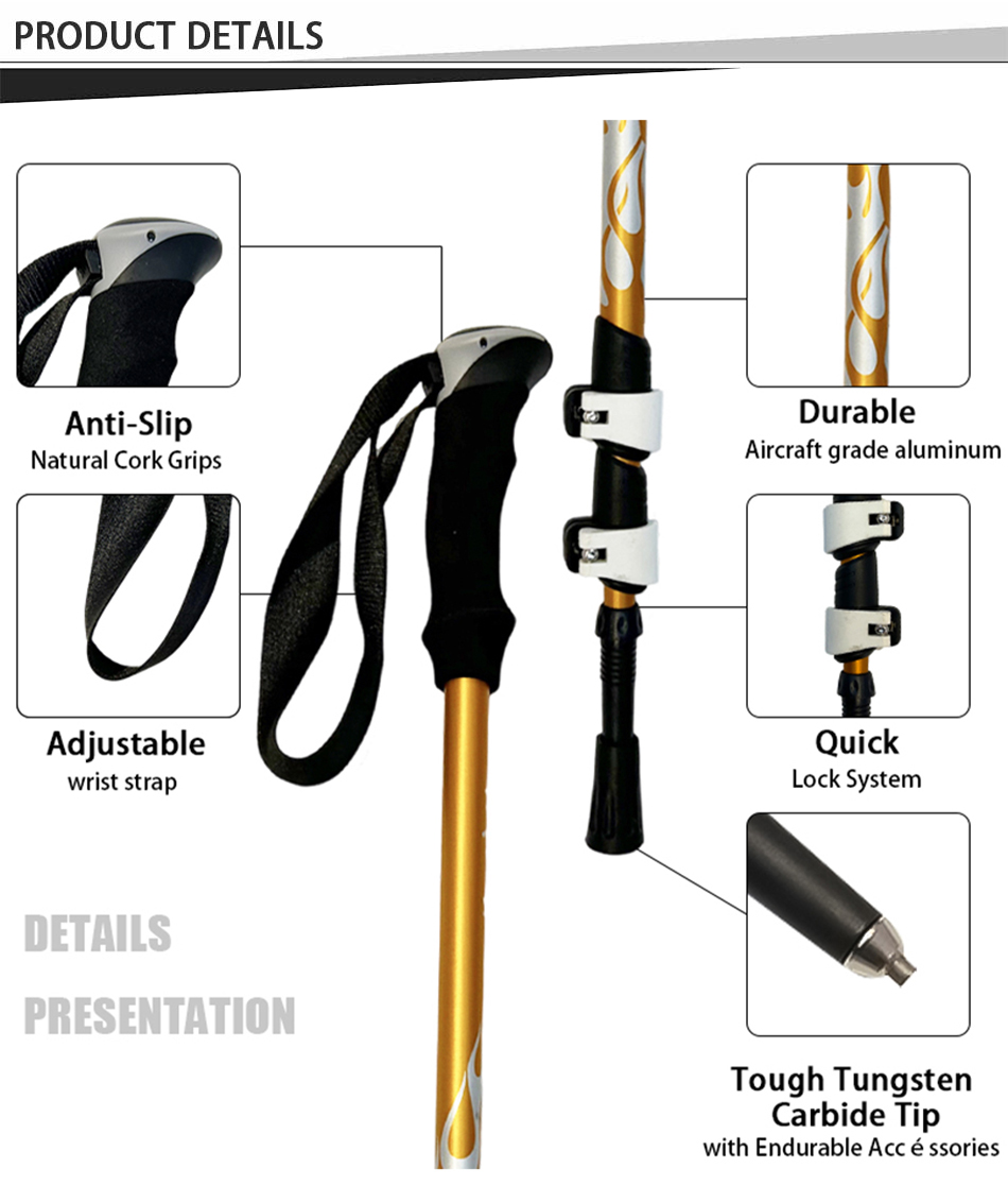 Marca: FABBRICA ANHUI FEISTEL Relativo alla produzione: OEM e ODM Prodotto: Bastoncino da trekking telescopico leggero in alluminio 6013: chiusure rapide a regolazione, resistente, versatile, ergonomico, leggero, ideale per l'escursionismo, lunghezza personalizzabile, resistente.