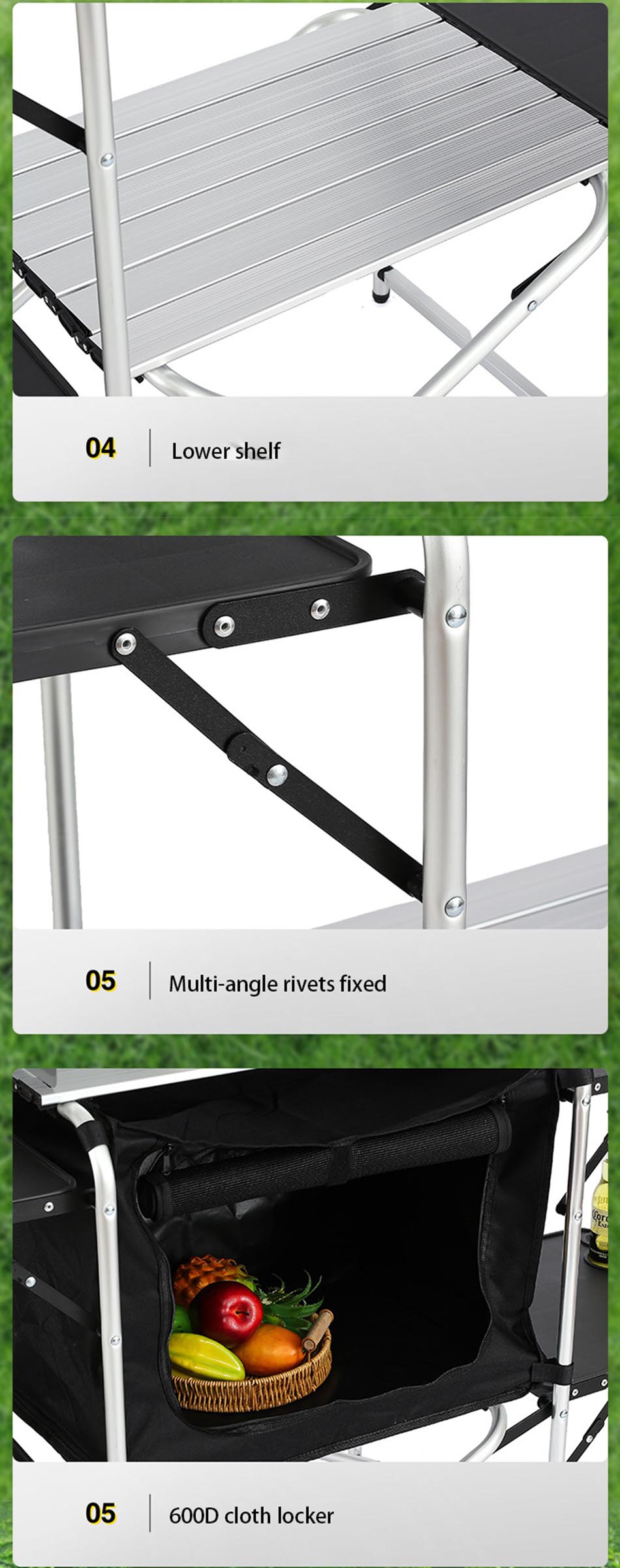1. Design del tavolo da campeggio pieghevole : il design pieghevole del tavolo è comodo da trasportare e consente di risparmiare spazio. 2. Facile da montare, non sono necessari altri strumenti e il tavolo può essere assemblato in pochi secondi, risparmiando tempo e fatica. 3. Super resistente e stabile: realizzato in lega di alluminio di alta qualità, robusto e durevole, impermeabile e facile da pulire. 4. Servizio personalizzato: sono disponibili diverse dimensioni e colori tra cui scegliere e puoi anche personalizzare il logo. 5. Multiuso: particolarmente adatto per attività all'aperto, utilizzato come tavolo da campeggio all'aperto, escursionismo, picnic, barbecue, tavolo da picnic, pesca, spiaggia e uso interno.