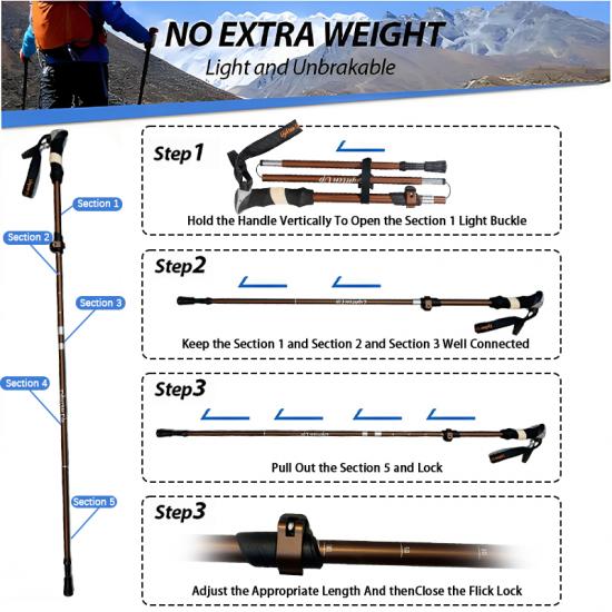 Prodotto : Il bastoncino da trekking pieghevole a cinque sezioni in lega di alluminio 6061 ultraleggero offre stabilità regolabile, un design resistente e una comoda impugnatura in EVA per un supporto affidabile durante le camminate all'aperto.