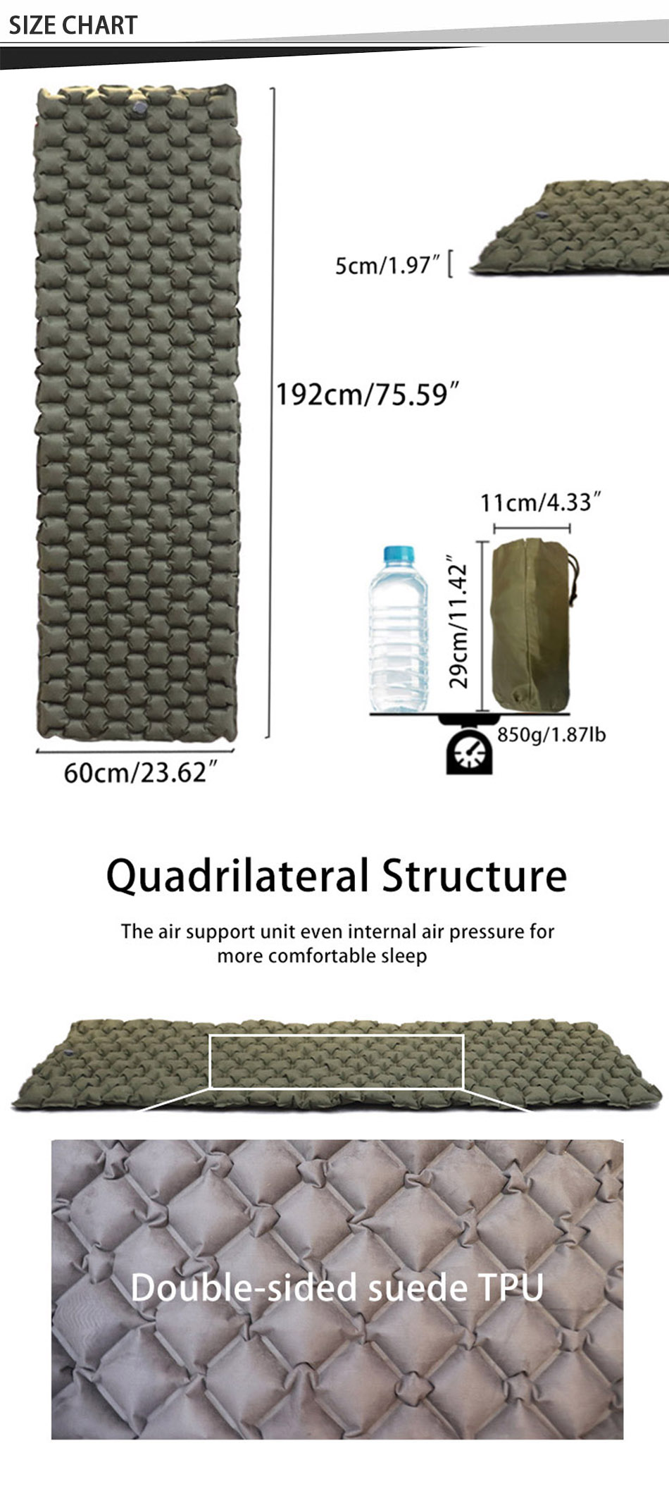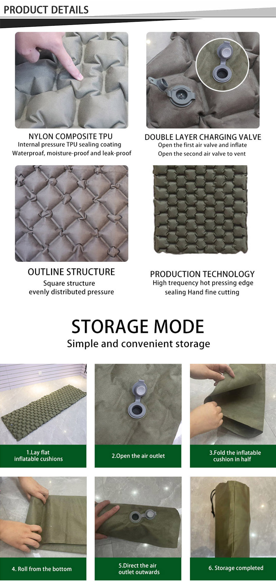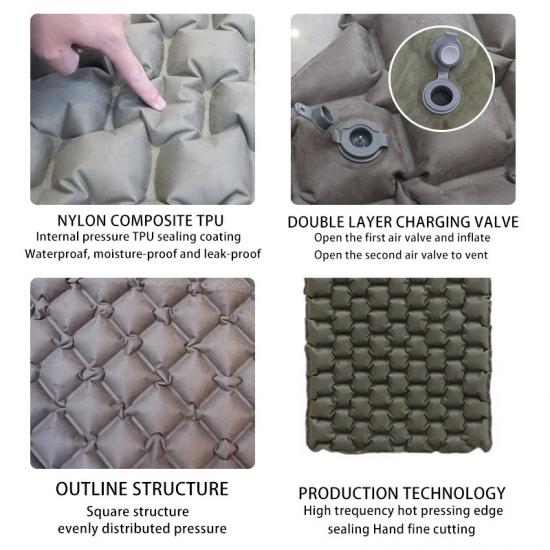 I tappetini gonfiabili automatici da campeggio all'aperto sono un'attrezzatura da esterno molto pratica. È realizzato in materiale Chunya Textile e rivestito in PVC, che ha le caratteristiche di elevata elasticità, comfort e resistenza all'usura.