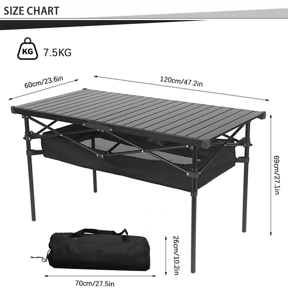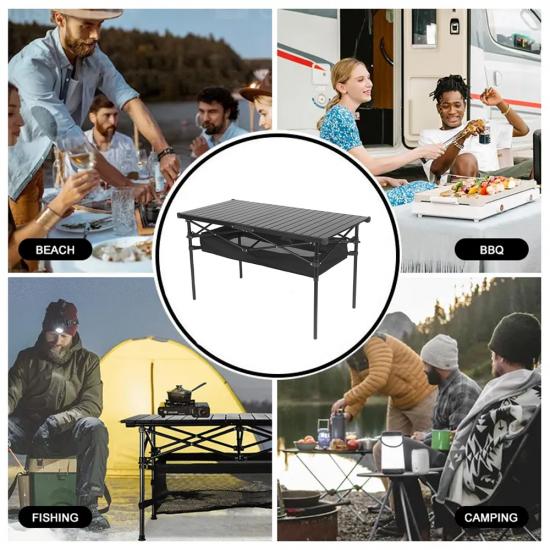 Marca : FABBRICA ANHUI FEISTEL Produzione correlata : OEM e ODM Prodotto : tavolo da picnic arrotolabile portatile da esterno: design in alluminio leggero e resistente con altezza regolabile, facile installazione e borsa da trasporto compatta per campeggio, picnic e attività all'aperto.
