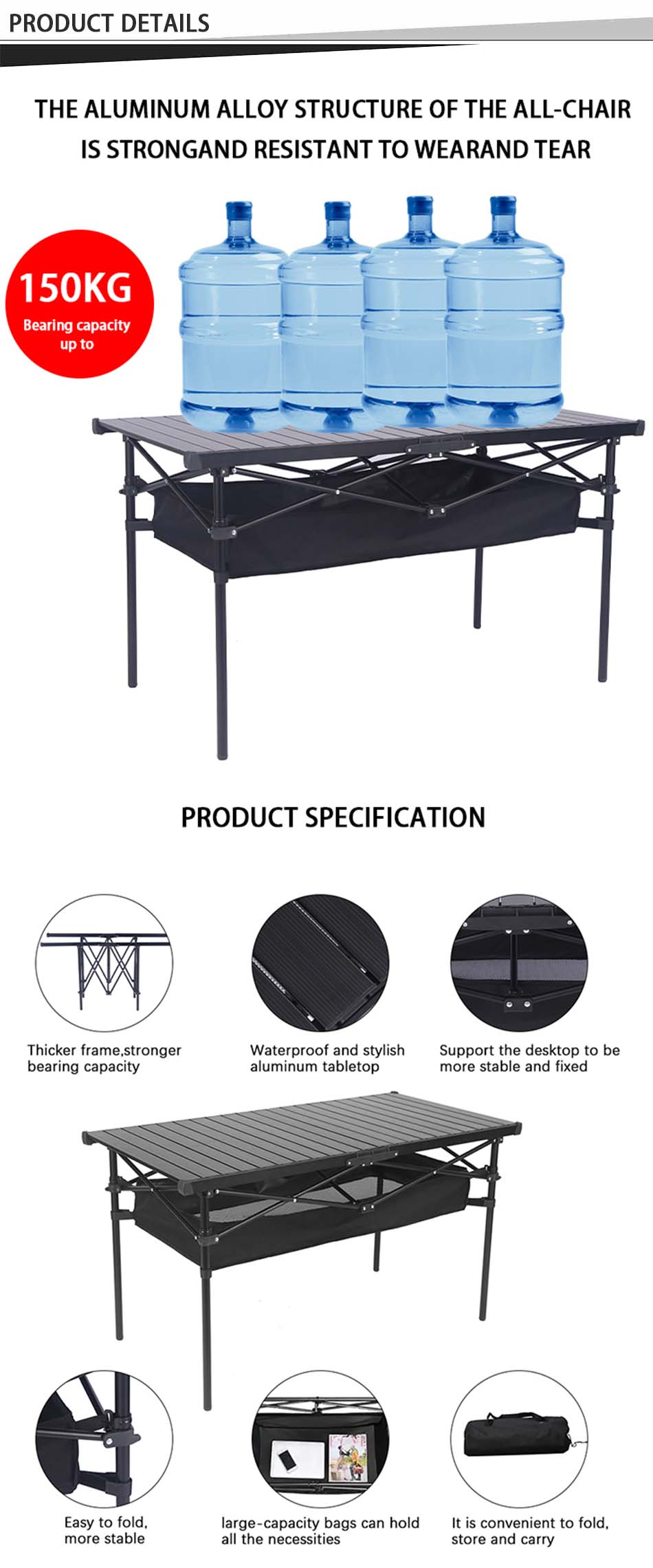 1. Design del tavolo da campeggio pieghevole : il design pieghevole del tavolo è comodo da trasportare e consente di risparmiare spazio. 2. Facile da montare, non sono necessari altri strumenti e il tavolo può essere assemblato in pochi secondi, risparmiando tempo e fatica. 3. Super resistente e stabile: realizzato in lega di alluminio di alta qualità, robusto e durevole, impermeabile e facile da pulire. 4. Servizio personalizzato: sono disponibili diverse dimensioni e colori tra cui scegliere e puoi anche personalizzare il logo. 5. Multiuso: particolarmente adatto per attività all'aperto, utilizzato come tavolo da campeggio all'aperto, escursionismo, picnic, barbecue, tavolo da picnic, pesca, spiaggia e uso interno.