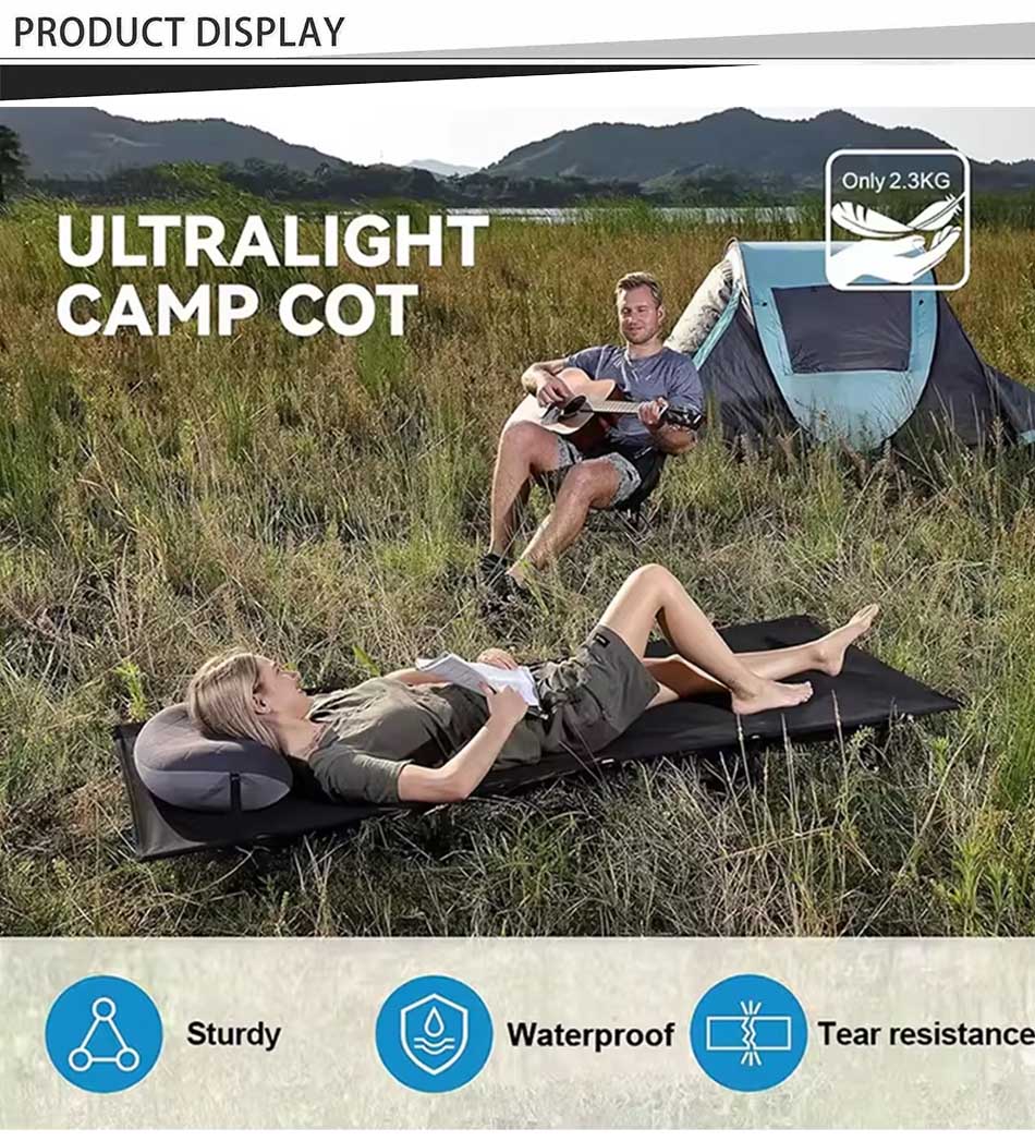 Marca : FABBRICA ANHUI FEISTEL Produzione correlata : OEM e ODM Prodotto : Un lettino da campeggio in alluminio ultraleggero e pieghevole, perfetto per lo zaino in spalla. Compatto, resistente e facile da configurare, offre comfort e praticità per le avventure all'aria aperta.