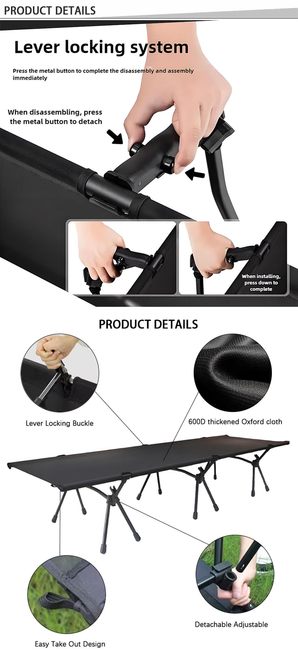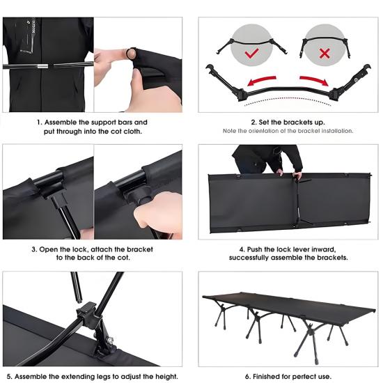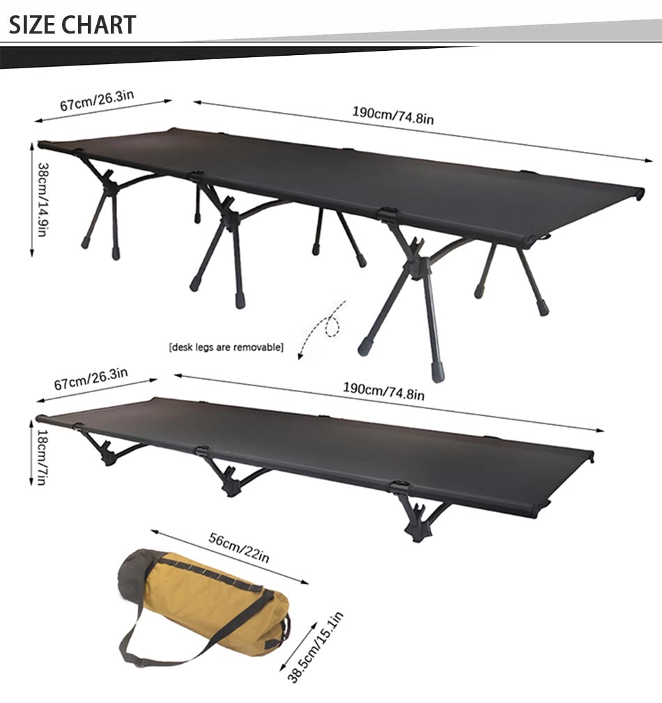 Prodotto : Il lettino da viaggio per attrezzatura da escursionismo all'ingrosso è un lettino da campeggio pieghevole ad altezza regolabile che offre un supporto robusto, una facile trasportabilità e un riposo confortevole per le avventure all'aria aperta.