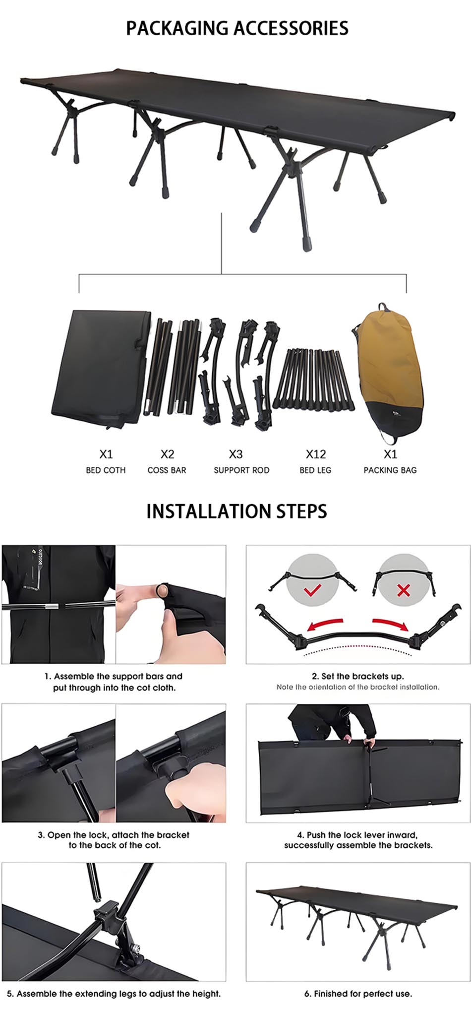 Il lettino da campeggio pieghevole con altezza regolabile e letto da viaggio Wholesale Hiking Equipment è una soluzione versatile e resistente per dormire all'aperto, progettata per campeggiatori, escursionisti e viaggiatori che cercano comfort e praticità in ambienti difficili; realizzato con una robusta struttura in metallo e tessuto resistente, questo lettino offre un supporto affidabile e un utilizzo duraturo, mentre la sua funzione di altezza regolabile consente agli utenti di personalizzare la posizione di sonno per un comfort ottimale e un allineamento ergonomico; il design pieghevole consente un montaggio rapido e uno stoccaggio compatto, rendendolo facile da trasportare e trasportare per le avventure all'aperto; la sua struttura elevata tiene gli utenti lontani dal terreno freddo e irregolare, migliorando la qualità del sonno e riducendo il disagio; ideale per escursioni, campeggio o uso di emergenza, questo lettino portatile combina resistenza, regolabilità e praticità per garantire un'esperienza riposante ovunque ti porti il tuo viaggio.